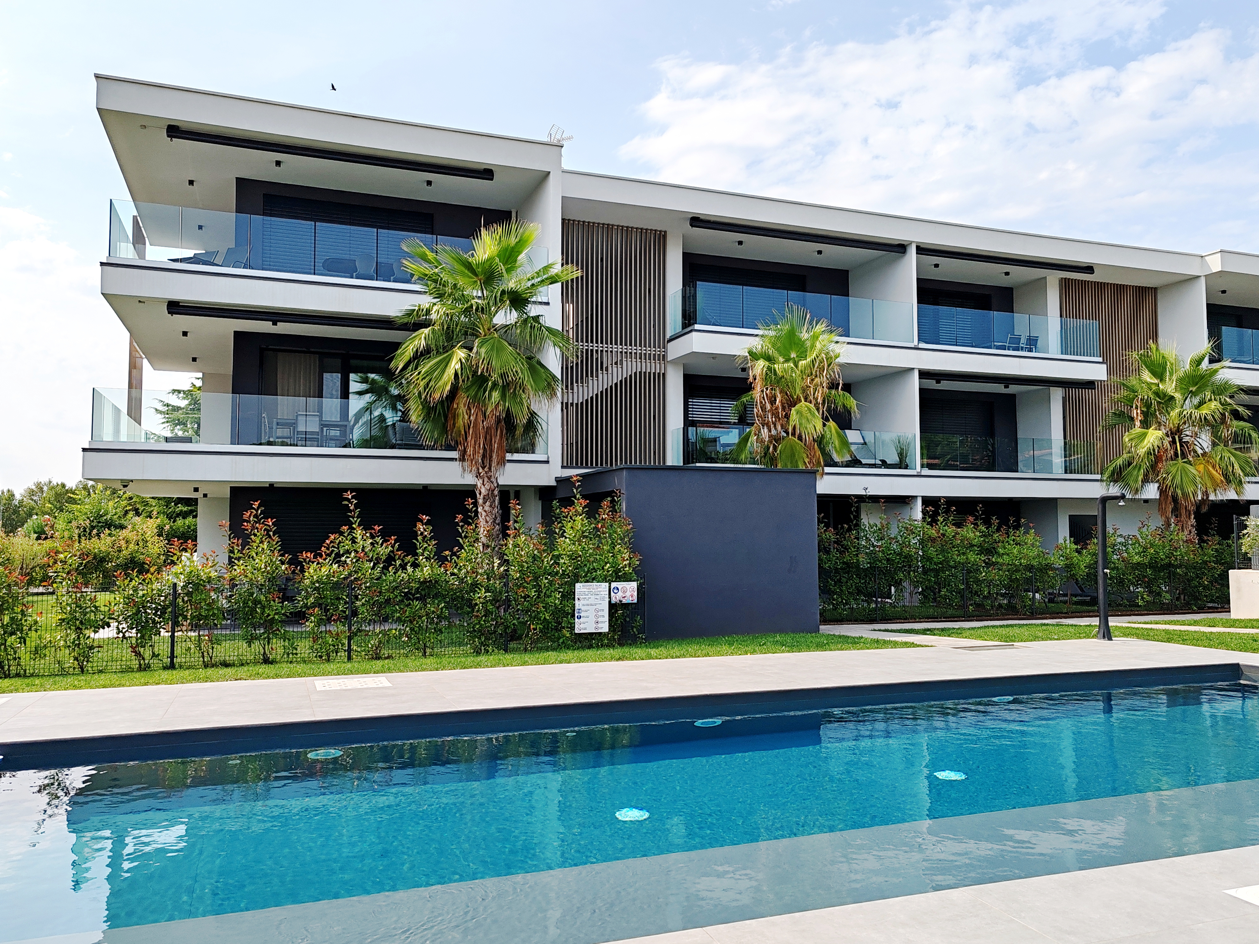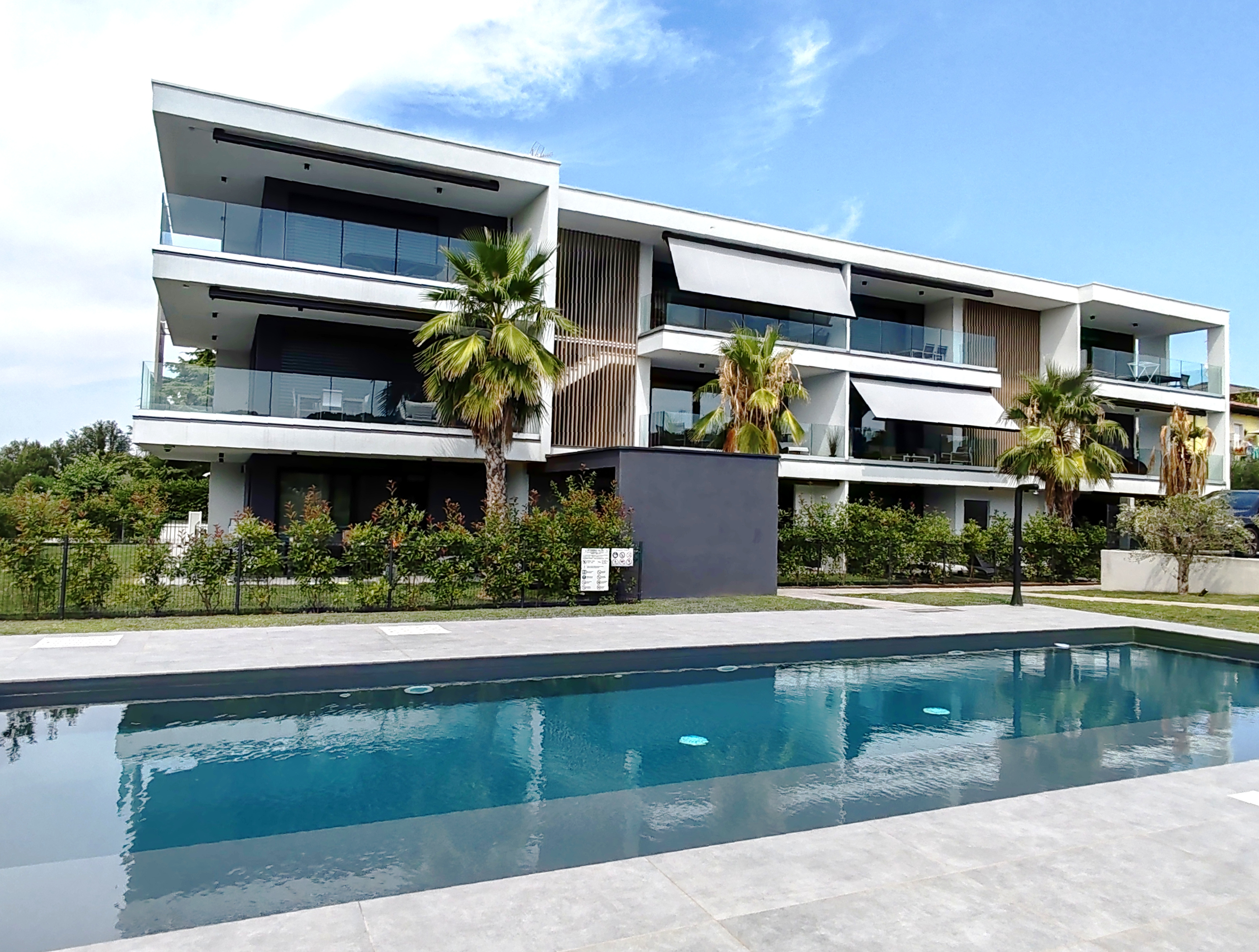 L’appartamento è composto da una zona living con zona cottura ampia e luminosa, che si apre su un bel terrazzo con vista sulla piscina. Attraverso un disimpegno si raggiungono due camere da letto e un bagno; un secondo bagno si trova all’interno della camera da letto matrimoniale. Le camere si affacciano su un balcone di servizio. Disponibili posto auto privato interno al cortile, internet ad alta velocità, TV satellitare, smart TV.